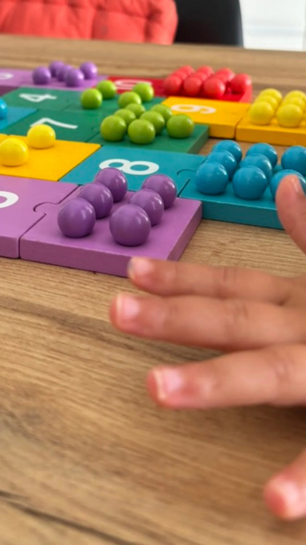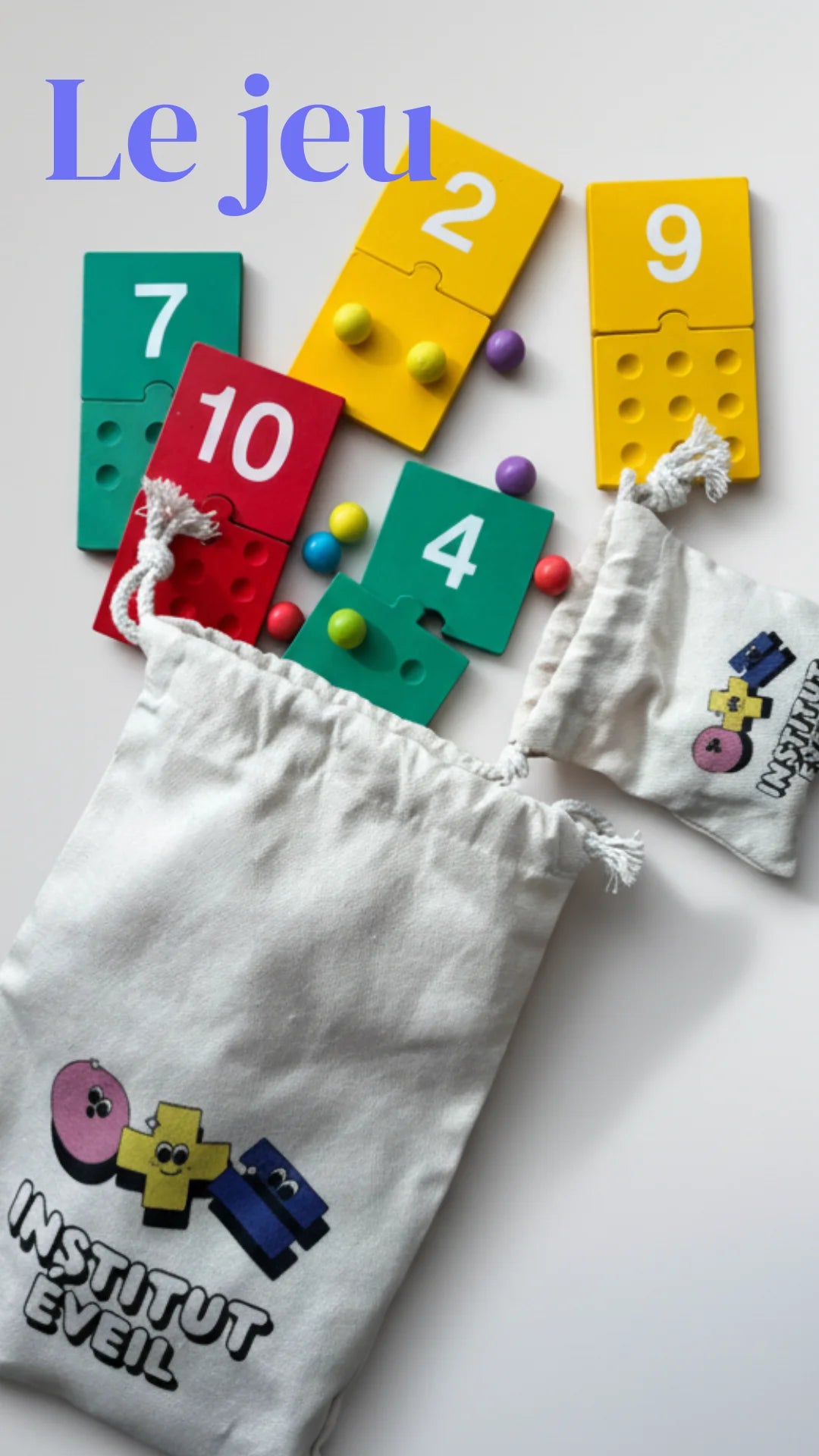 Le jeu cible la correspondance quantité ↔ nombre, la sériation et le langage du nombre grâce à des manipulations guidées.